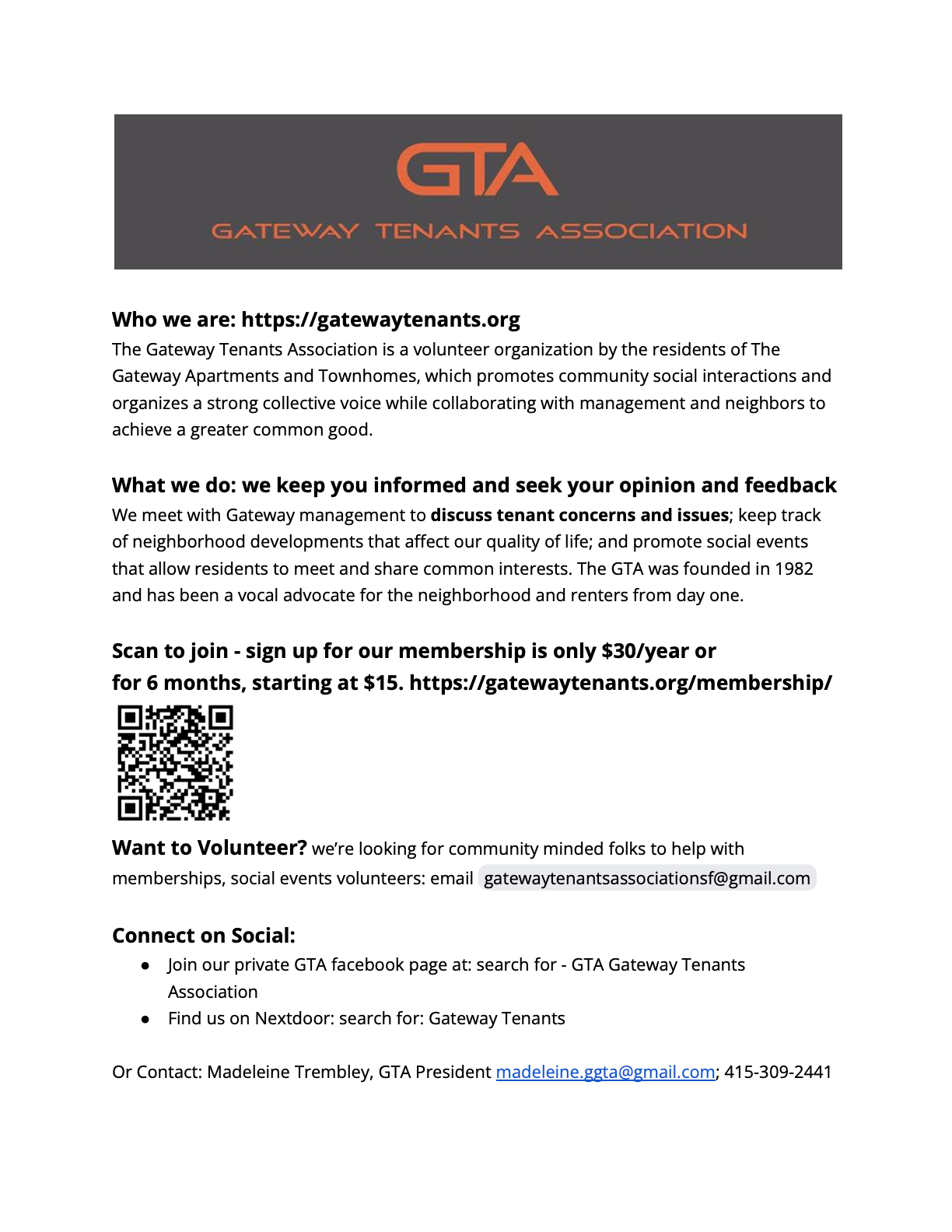 Gateway Tenants Association is a registered 501(c)3 non-profit organization based in San Francisco, California, USA. All donations made to the Gateway Tenants Association are tax-deductible to the full extent allowed by law.
